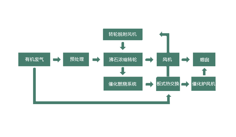 2) 經預處理後的有機(jī)廢氣,再(zài)進入(rù)沸石轉輪吸附區,廢氣中的V0Cs被沸石吸附,淨化後的(de)氣體直接達標排放,而(ér)吸(xī)附過VOCs的沸石隨轉輪轉動進入冷卻區,在原(yuán)有廢氣風量15~25分之一的常溫氣體作(zuò)用(yòng)下冷卻下來(110℃),隨後在風機作(zuò)用下經加熱器預熱至脫附溫度:180~220℃(亦可以通過(guò)催化床排放高溫氣體換熱預熱),將VOCS從沸石中脫附出來,形成小風量、高濃度的VOCs尾氣;