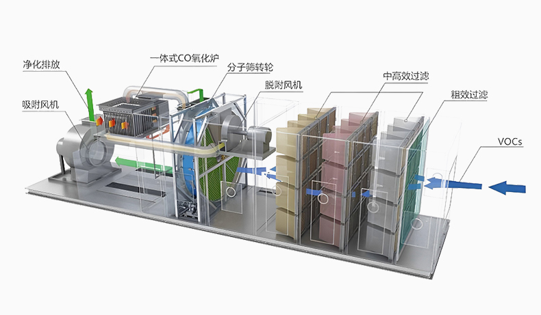 3) 脫附產生的高濃(nóng)尾氣在係統風機作用下經換熱器預熱升溫、加熱器(qì)加熱至催化劑話性溫度(300℃左(zuǒ)右)後,進入催化床並發生氧(yǎng)化分解(jiě)反應,同時放出熱量,該反應(yīng)形成的高溫尾氣再依次與轉輪冷卻氣(qì)、脫附(fù)氣換熱後排放。