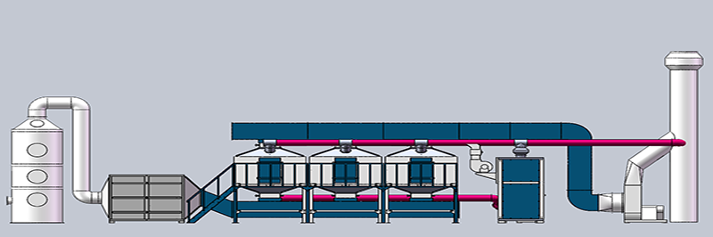 (2)經捕捉後的廢氣進入深度淨化係統(tǒng),當活性炭吸附器接近飽和時(shí),用熱氣流對活性炭(tàn)吸附器進行解吸脫附,將有(yǒu)機物從(cóng)活性(xìng)炭(tàn)上脫附下來。在脫附過程中,有機(jī)廢氣已被濃縮,濃度較原來提高幾(jǐ)十倍,達2000ppm以上,濃縮廢氣送到(dào)催化分解裝置,最後被成為CO2與H2O。深(shēn)度淨化後通過風機煙囪達標排放。