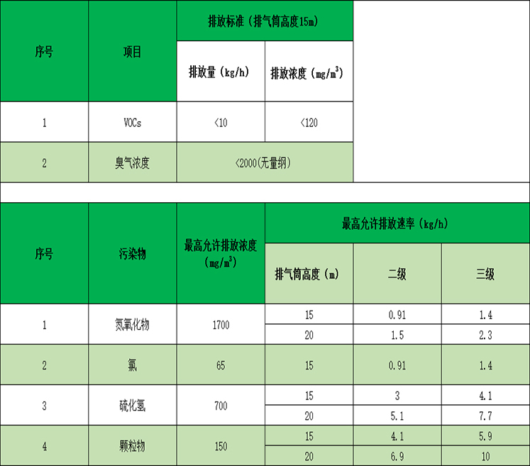 廢氣(qì)排放標準執行《大氣汙染物綜合排放標準》(GB16297-1996)、《惡臭物質排放標準》(GB14554-93)二級標準,排放標(biāo)準如下: